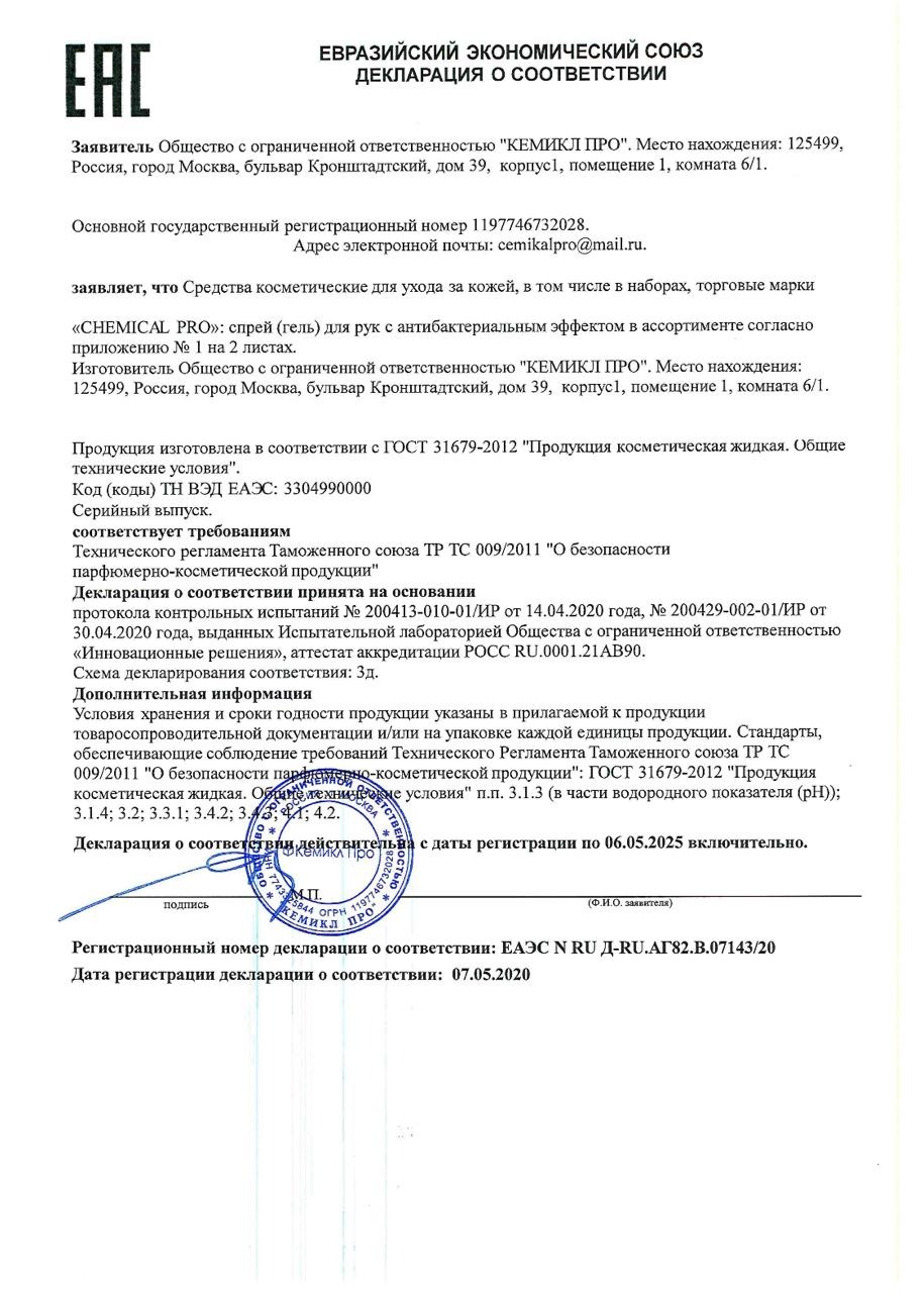 Декларация о соответствииИзопропиловый спирт, хлоргексидин, глицерин, вода.